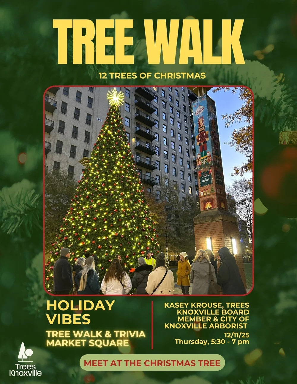 Come enjoy a fun and festive holiday event for all ages. Walk through downtown Knoxville with Knoxville’s Urban Forester, Kasey Krouse, as we visit 12 unique trees decorated for the season. At each stop, participants will answer a trivia question and fill in their event form. The top three participants with the highest score will win gift cards.