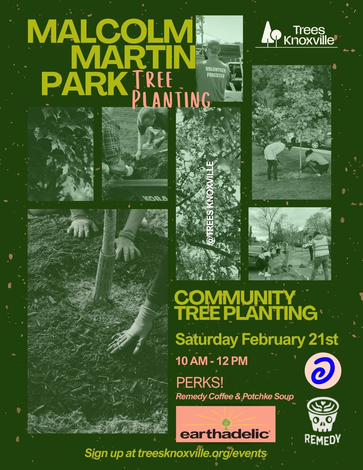 Join Trees Knoxville for a family-friendly community tree planting at Malcolm Martin Park. Volunteers will help plant 36 trees in this public park, supporting a healthier and more resilient urban canopy for Knoxville.
